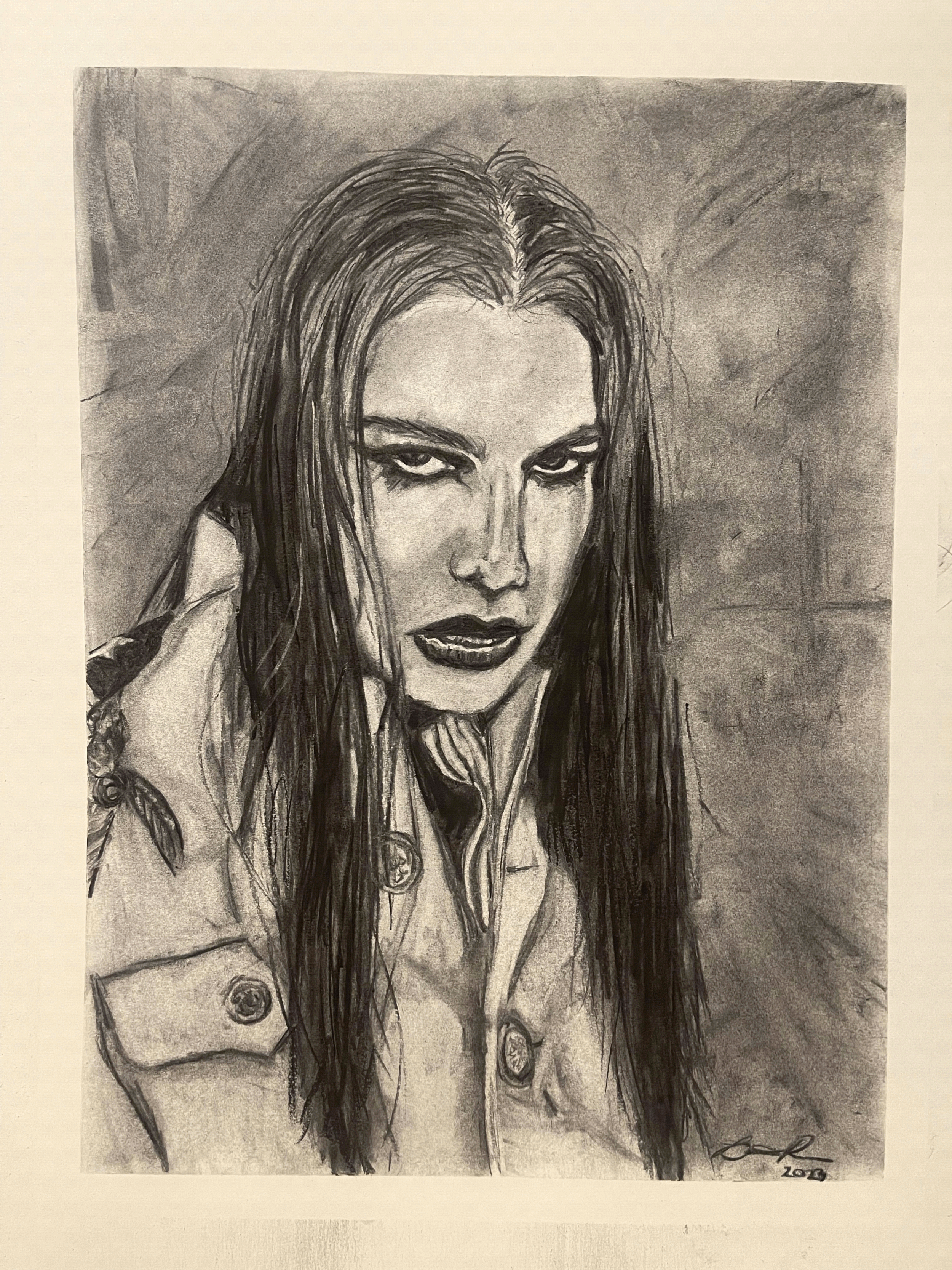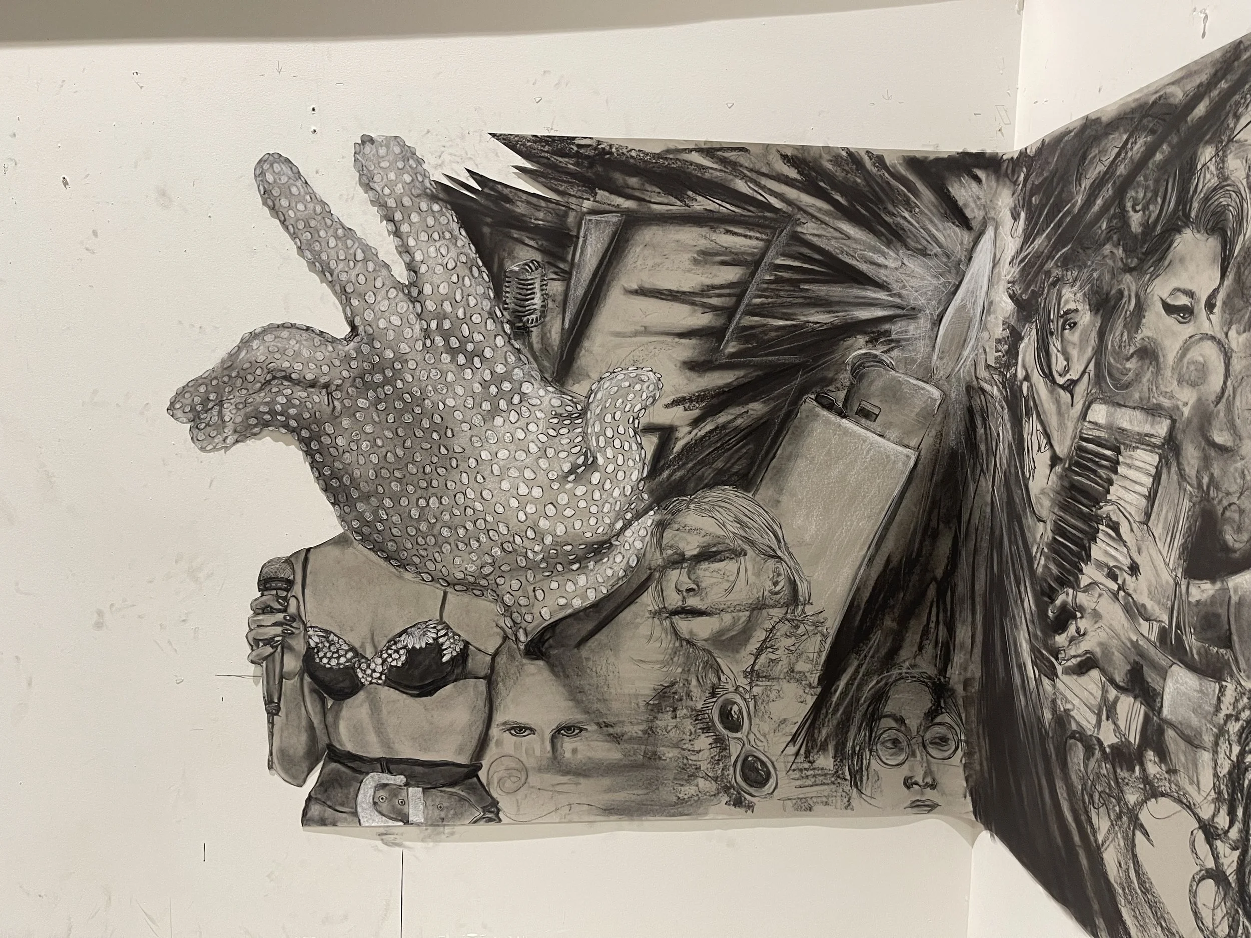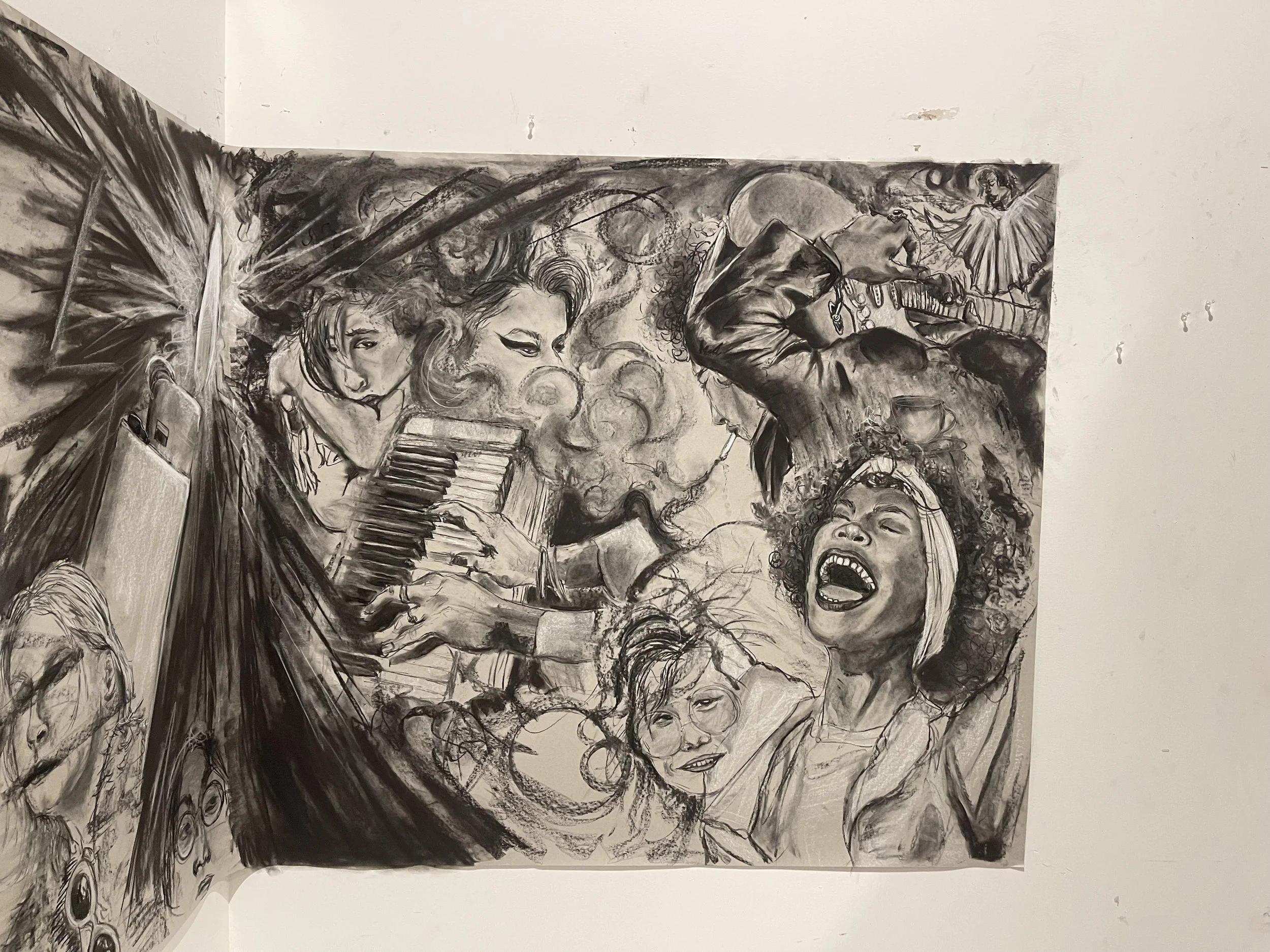 The Other Side of the Record Deal. Charcoal on Paper. 91 x 40 in. Left to Right: SELENA QUINTANILLA, MICHAEL JACKSON, JIM MORRISON, JEFF BUCKLEY, DAVID BOWIE, KURT COBAIN, JOHN LENNON, AMY WHINEHOUSE, FREDDIE MERCURY, JANIS JOPLIN, JIMI HENDRIX, WHITNEY HOUSTON, FREDDIE MERCURY.