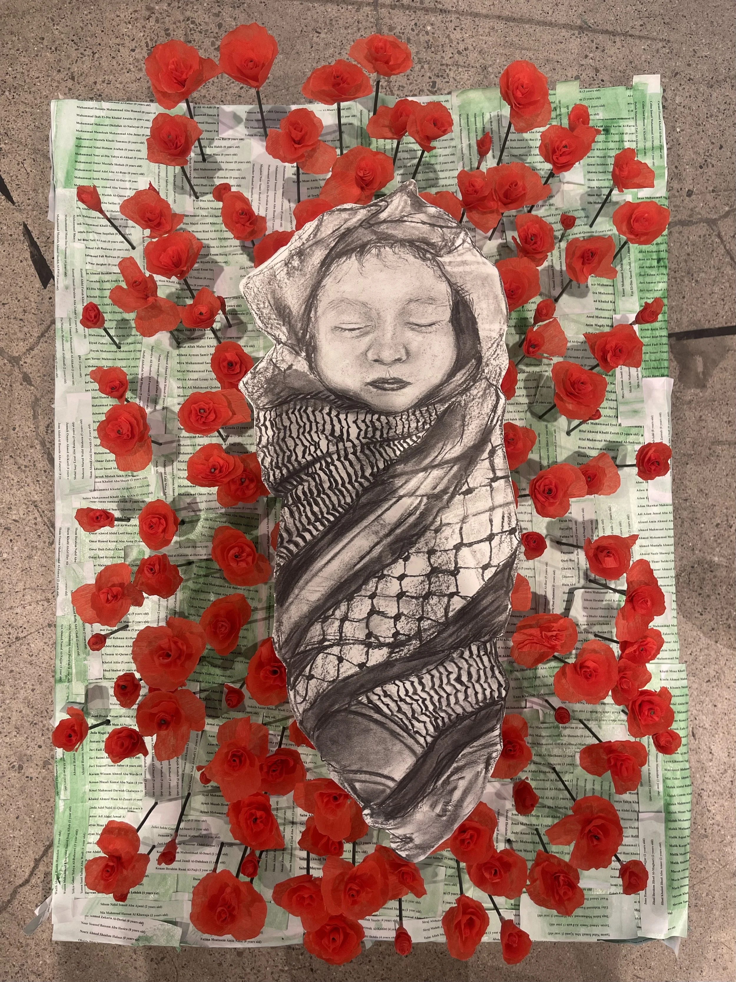 FOR THE CHILDREN OF PALESTINE, 2023. CHARCOAL ON PAPER, ORANGE STREAMER, WOODEN SKEWERS, PRINTER PAPER, MEMORY FOAM BASE. 22 X 32 IN.
